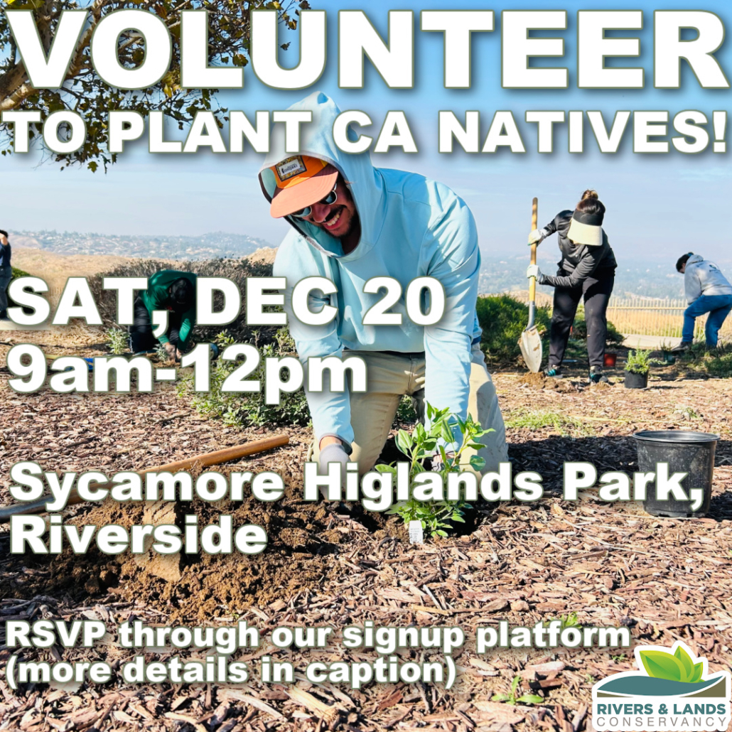 Join Rivers & Lands Conservancy staff on Saturday, December 20th from 9am-12pm to help us plant California native plants at Sycamore Highlands Park, located in the City of Riverside! We will be continuing efforts to expand our California native plant garden footprint within the Park. Participating volunteers will be using hand tools to assist with planting and carrying buckets of water to assist with watering.