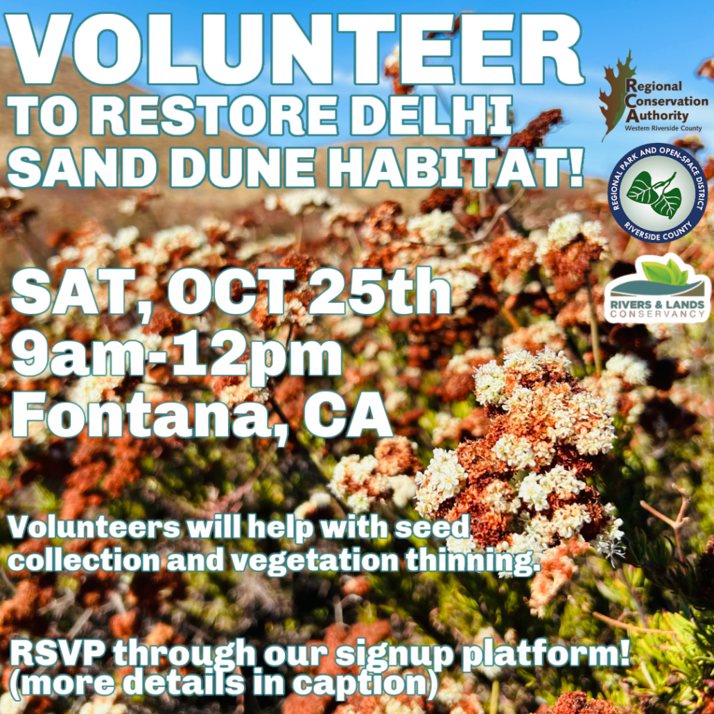Volunteer to help restore Delhi Sand Dune habitat with us on Saturday, October 25th from 9am-12pm at a unique conservation site located in the Jurupa Hills! Participating volunteers will be assisting with California native plant seed collection and vegetation thinning activities to support habitat restoration for the endangered Delhi Sands flower-loving fly and other wildlife that call the Delhi Sand Dunes home. Volunteers will be walking approximately 1-2 miles over uneven, dirt terrain for the duration of the event. All ages welcome.