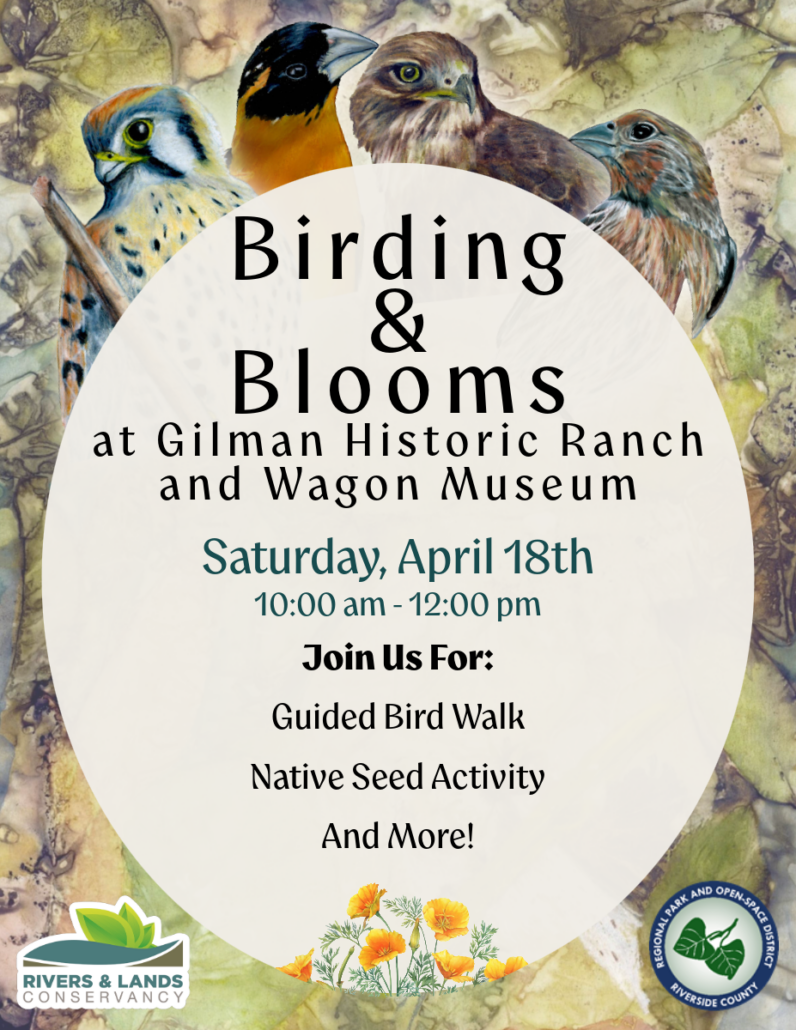 Join us for a morning of nature and discovery at our “Birding and Blooms” community event at the Gilman Historic Ranch and Wagon Museum! Hosted in collaboration with the Riverside County Regional Park and Open-Space District, this family-friendly event offers a variety of ways to connect with the outdoors.