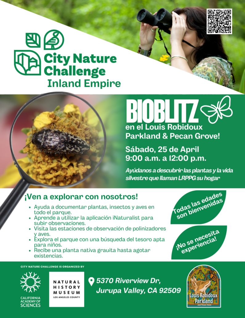 Join Rivers & Lands Conservancy staff and our project partners at the Louis Robidoux Parkland & Pecan Grove for a City Nature Challenge, a worldwide event where communities across the globe race to document as much biodiversity as possible by conducting a bioblitz! All you need is your phone and the iNaturalist app. We’ll help you get set up, show you what to look for, and before you know it, you’ll be spotting things you never noticed before! 🐿️🦎🪶🐝🌻🌱